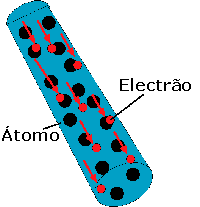 Isto é o que acontece num fio. A deslocação dos electrões ao longo do fio criam a corrente eléctrica (consulta a figura).